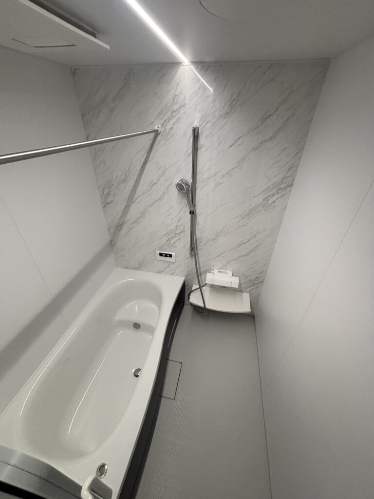ポイント:フラットラインLED照明で空間全体を明るく、カビシャット暖房換気乾燥機で清潔に、スゴピカ浴槽・スゴピカ水栓・ミスピカフロアで汚れにくくキレイが続く、快適空間「オフローラ」 / パナソニック